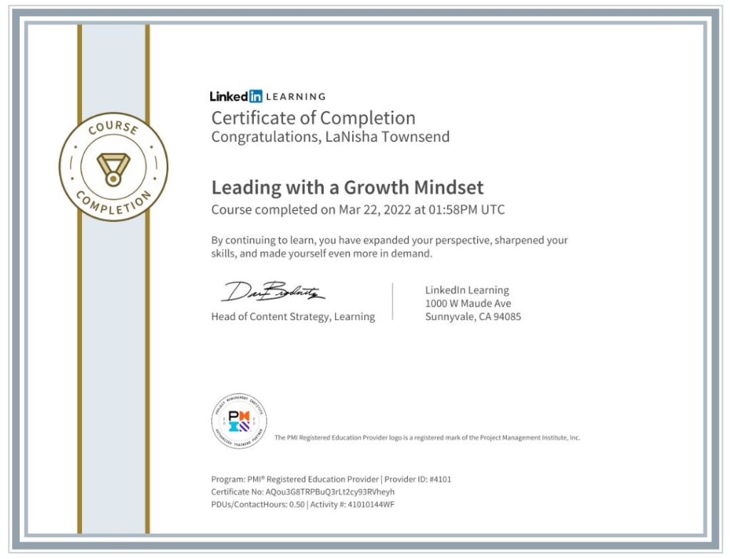 - 2022: LinkedIn Certification, Leading with a Growth Mindset